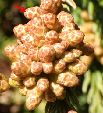 スギの花は雄花と雌花が別につきます。花粉を出す雄花では11月頃までに花粉を形成し、休眠に入ります。雄花から花粉の入っている花粉嚢(矢印)も見られますがまだ硬いようです。 |